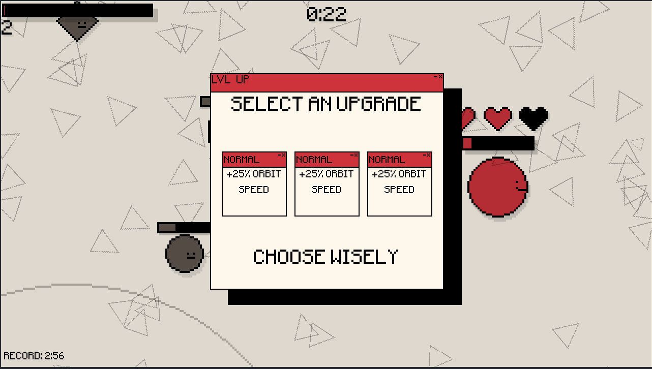 Defeat enemies, earn upgrades, orbit and destroy! When you orbit you are invincible but careful your rage meter drains, and if it gets to 0 you lose a heart! When you hit enemies in orbit, they take damage, another way to damage them is to dash into them, but careful after a dash you are vulnerable! Survive as long as possible and level up!